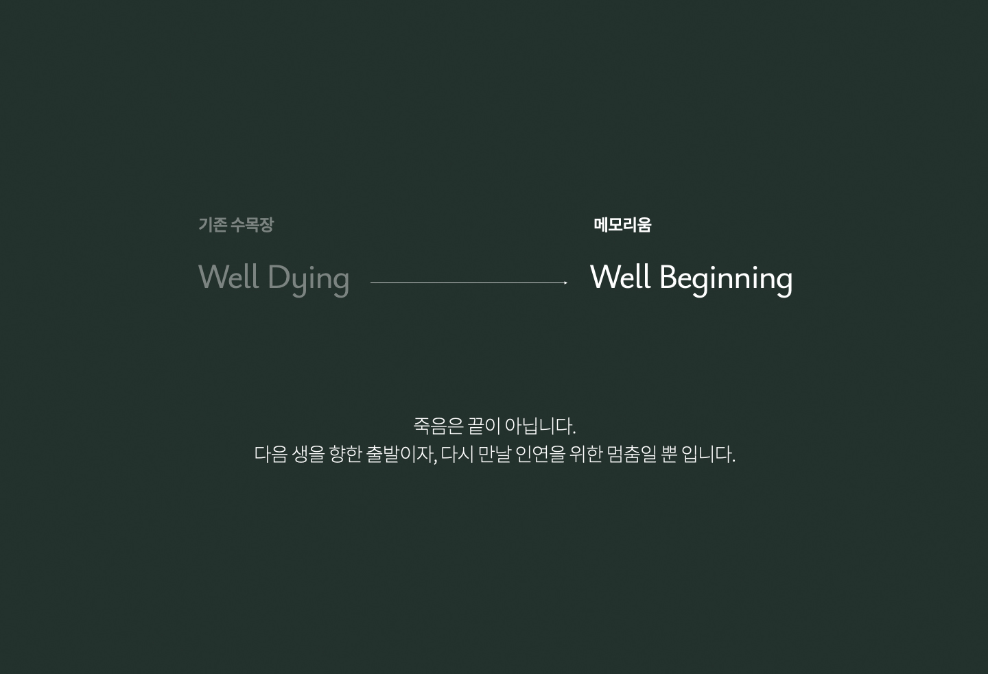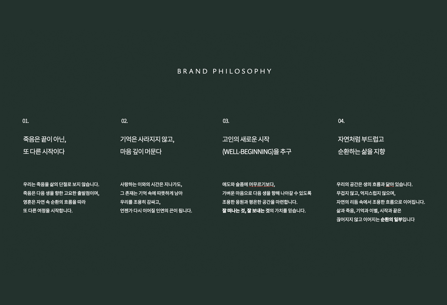 삶의 마지막을 기억하는 수목장. 남들은 WELL DYING을 외칠 때 저희는 생각이 달랐습니다. '죽음'은 '끝'이 아닌 '또 다른 시작'임을. 그래서 우린 WELL-BEGINNING 으로 수목장을 새롭게 정의하고, 브랜드 작업을 펼쳐가게 되었습니다.