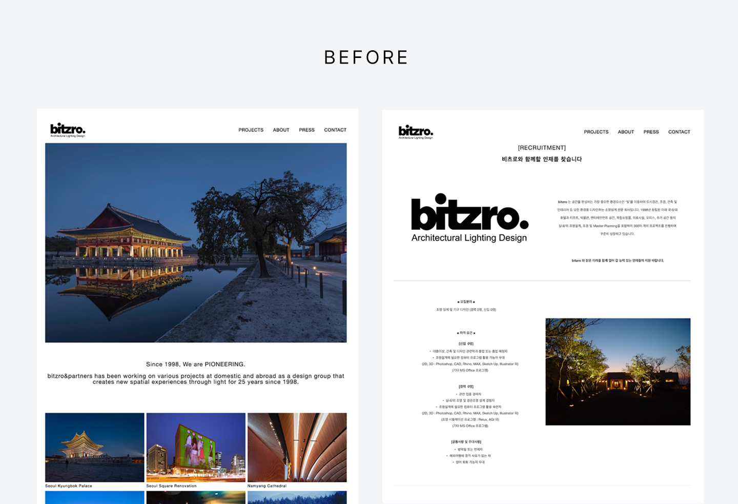 사유원, 유원재, 경복궁, 국립현대 등 국내 1세대 라이팅 디자인 그룹. 98년부터 누적되어 1,200여개 넘는 포트폴리오를 정리하여 한 회사의 공식 포트폴리오 웹사이트를 리뉴얼하는 '대공사' 프로젝트.