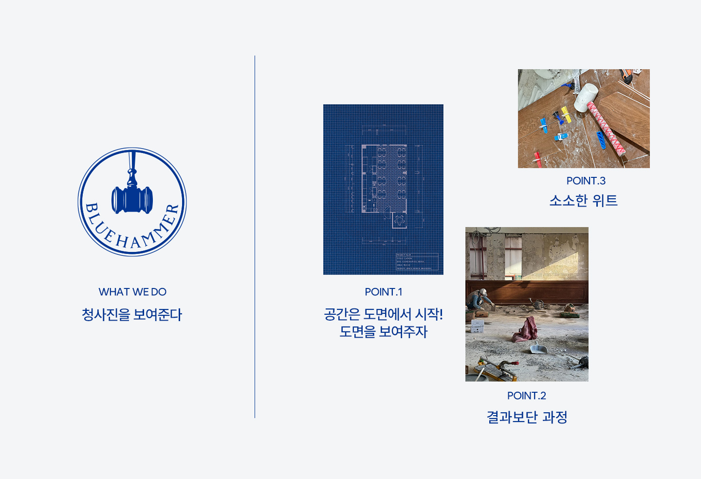 대기업부터 핫한 브랜드들의 공간 디자인을 맡아 활약하고 있는 블루해머 팀의 웹사이트 리뉴얼을 맡게 되었습니다. 핵심은 '위트 있으면서 감도 있게' 였습니다. 그래서 저희는 이렇게 접근하기로 했습니다.